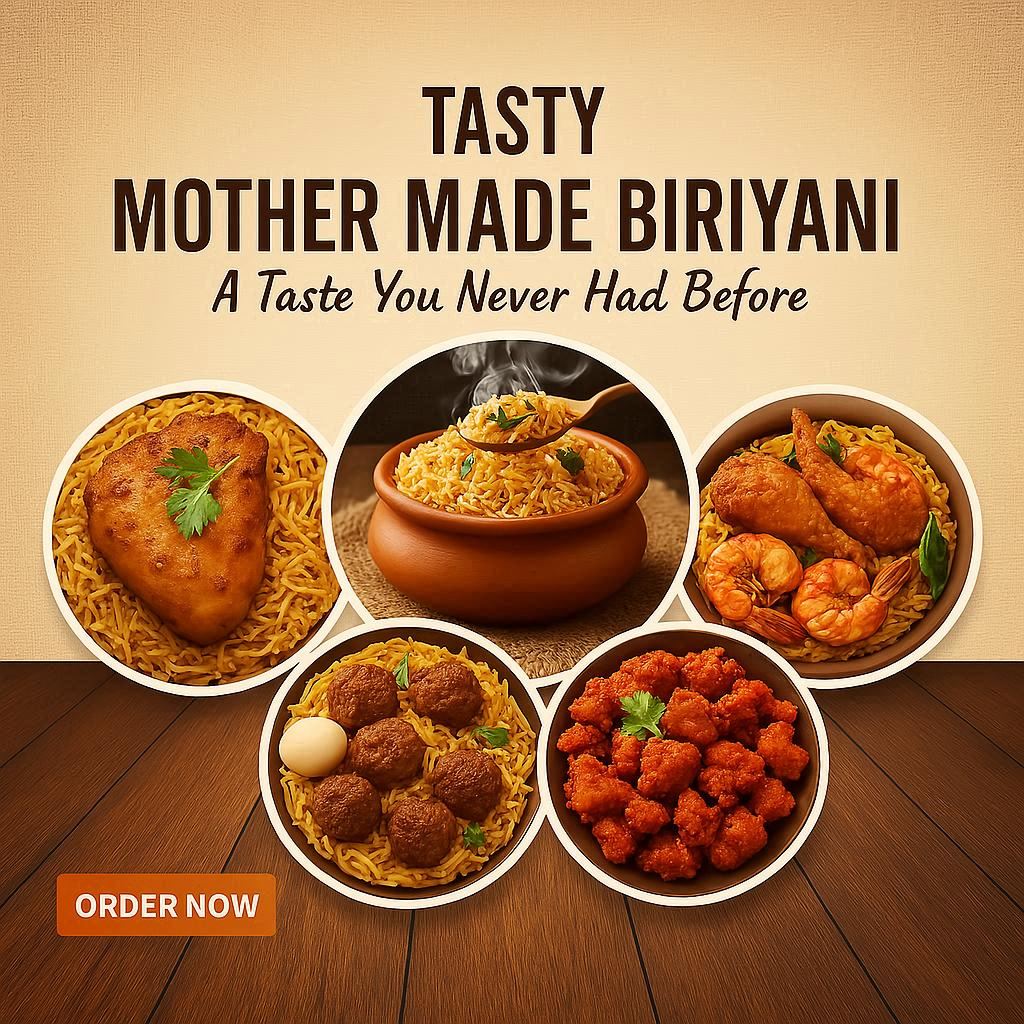Every biriyani we serve is made with the slow, patient methods our mothers and grandmothers trusted — hand‑ground masalas, carefully selected spices, and the kind of attention that only a mother gives while preparing for her family. We don’t rush. We don’t compromise. Because biriyani should touch the heart before it fills the stomach.